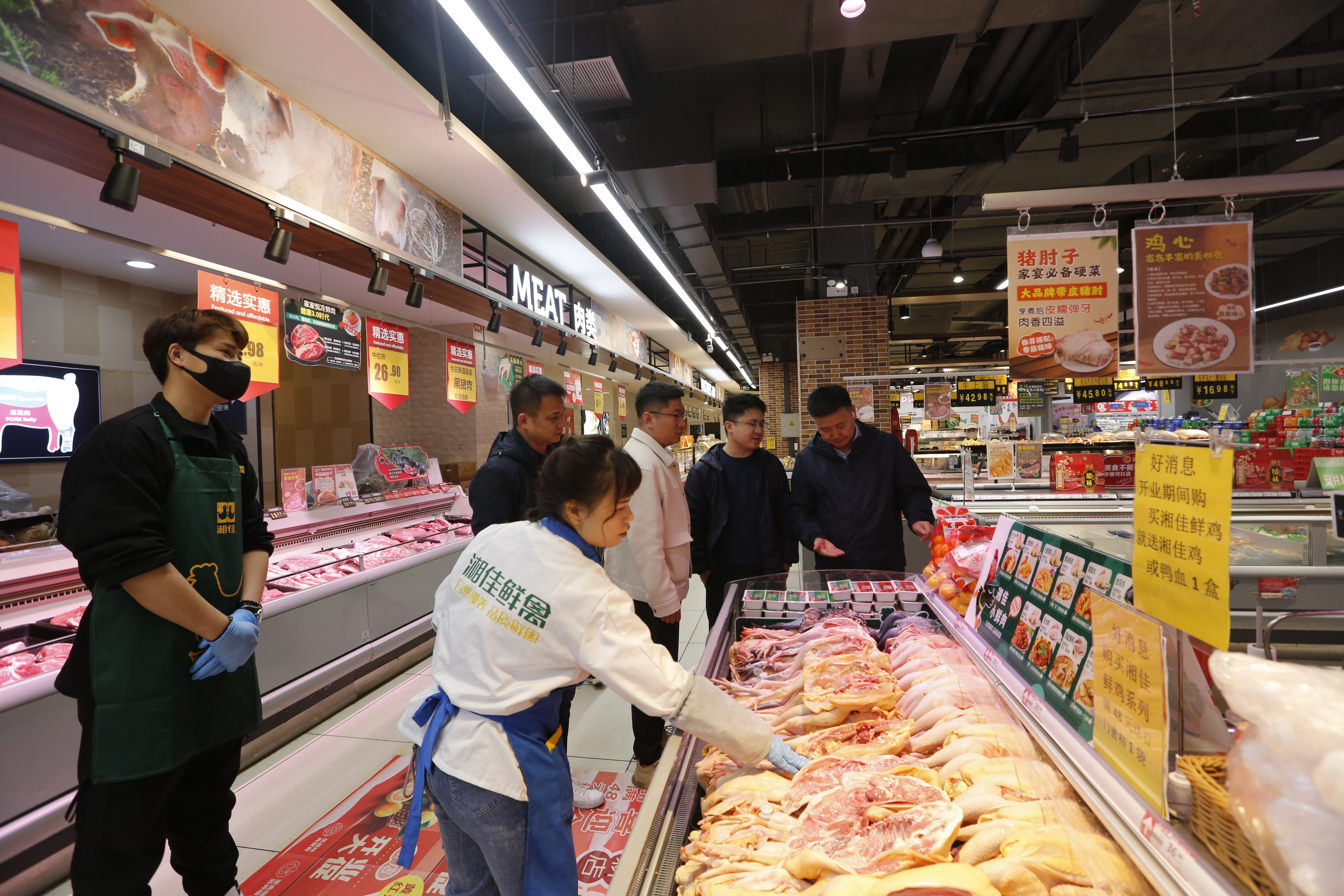 “從超市早上開門開始,就一直有顧客來詢問和購買我們公司的雞肉,第一天就在內蒙古這個新市場了一個開門紅。”工作人員一邊忙著給顧客剁肉,一邊給湘佳股份董事長喻自文和副總裁趙柯程匯報首日銷售情況。